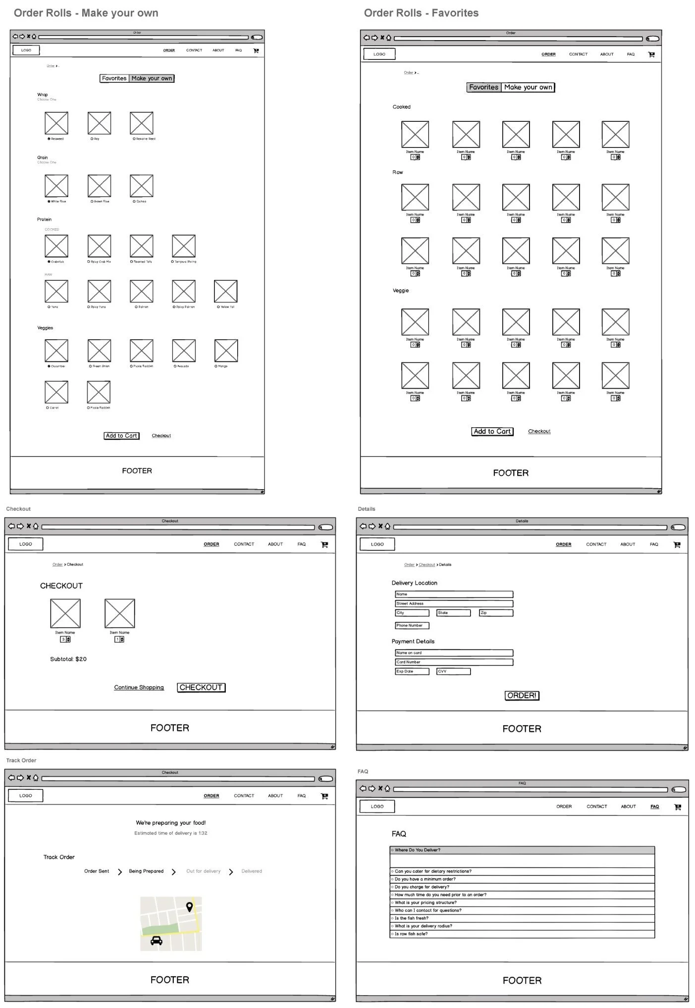 Comparing my product to the user and client needs that were laid out early on in the process, I notice a few things that could be improved upon. I feel the user needs were well addressed, however the client needs included conveying speed of service, affordability and deliciousness. I will start by saying that I am not pleased with the images I chose for the rolls. In an ideal world (and if the restaurant existed) I would have a photographer take pictures of the food to use on the website. This would allow the images to look delicious, and be uniform and cohesive as a group. I did not put in any information about how quick the delivery process was. There are various points throughout the design where users could be informed about their estimated delivery time, and perhaps somewhere comparing how much quicker our delivery service is to other restaurants.